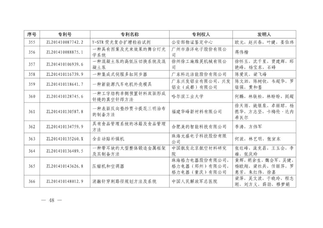 经中国专利奖评审委员会评审,社会公示,知识产权局和世界知识产权组织决定授予“含有银杏内酯的制剂及其制备工艺”等30项发明、实用新型专利中国专利金奖,“轨道车辆车头(2014-3)”等10项外观设计专利中国外观设计金奖;知识产权局决定授予“用于乙烯聚合的催化剂组分及其催化剂”等58项发明、实用新型专利中国专利银奖,“眼部按摩器(iSee4)”等15项外观设计专利中国外观设计银奖;知识产权局决定授予“一种由偶联法制备的含共轭二烯烃的苯乙烯类嵌段聚合物的选择氢化方法”等696项发明、实用新型专利中国专利奖,“耳机(一)”等60项外观设计专利中国外观设计奖。